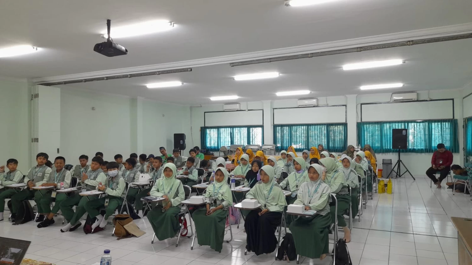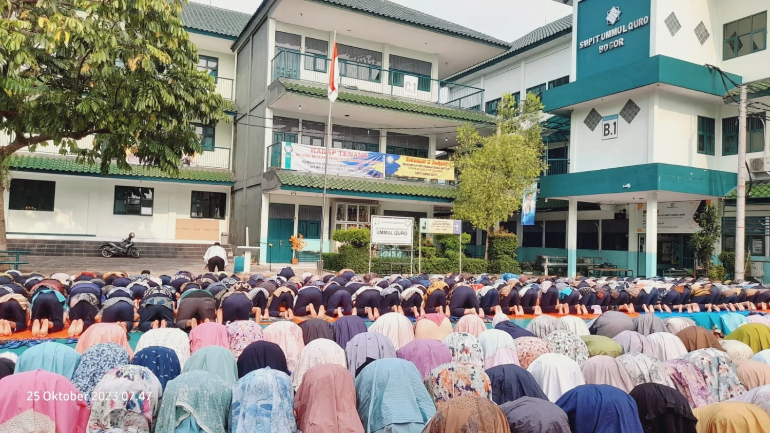 SIT Ummul Quro Bogor menggelar kegiatan Shalat Sunnah Istisqa berjama'ah di lapangan olahraga Kampus UQ 1, Salabenda, Bogor, Rabu, 25 Oktober 2023. Sebagaimana tujuan syariatnya, kegiatan ini digelar guna memohonkan turunya hujan, di daerah Bogor khususnya, dan semua daerah-daerah di Indonesia yang dilanda kekeringan. Shalat Sunnah Istisqa diikuti oleh segenap civitas akademika di lingkungan Kampus Ummul Quro 1, yang terdiri dari dewan guru, para siswa SDIT dan SMPIT, serta staff pegawai Yayasan Ummul Quro Bogor. Bertindak sebagai imam sekaligus pembaca do'a, Ust. Ahmad Rifai, M.EI, Koordinator Pesantren Qur'an SIT Ummul Quro Bogor. Kegiatan nampak berlangsung penuh khidmat dan khusyu'. Para peserta dengan penuh permohonan kepada Allah SWT agar segera menurunkan hujan di kota Bogor dan seluruh daerah di Indonesia yang dilanda kekeringan. Kepala SMPIT Ummul Quro Bogor, Mia Mariamah ST, menyampaikan bahwa kegiatan ini selain bertujuan memohonkan turunnya hujan, juga dalam rangka memberikan pembelajaran dan praktek ibadah kepada anak-anak terkait aneka ibadah, khususnya ragam shalat sunnah yang bisa laksanakan. "Semoga kegiatan ini memberikan pengalaman buat mereka serta memberikan penakanan kepada anak-anak kita, bahwa segala sesuatu harus kita kembalikan dan mintakan kepada Allah terkait segala hal dalam kehidupan kita, termasuk permohonan hujan ini," demikian ungkap Mia. "Selain itu, melalui kegiatan ini pun, mudah-mudahan anak-anak kita menjadi lebih tahu berbagai macam shalat sunnah yang bisa dibiasakan sehari-hari di rumah, termasuk shalat istisqa ini ketika dilanda musim kekeringan," tambahnya lagi. Berdasar pemantauan cuaca kemarin, rupanya permohonan yang dipanjatkan oleh Keluarga Besar SIT Ummul Quro dalam shalat istisqa tersebut langsung dikabulkan oleh Allah SWT. Nampak selama sore sampai menjelang maghrib, kota Bogor diguyur hujan yang cukup lebat. Banyak anak terlihat basah kuyup ketika jam pulang sekolah kemarin sore. *(Mans/26-10-23)