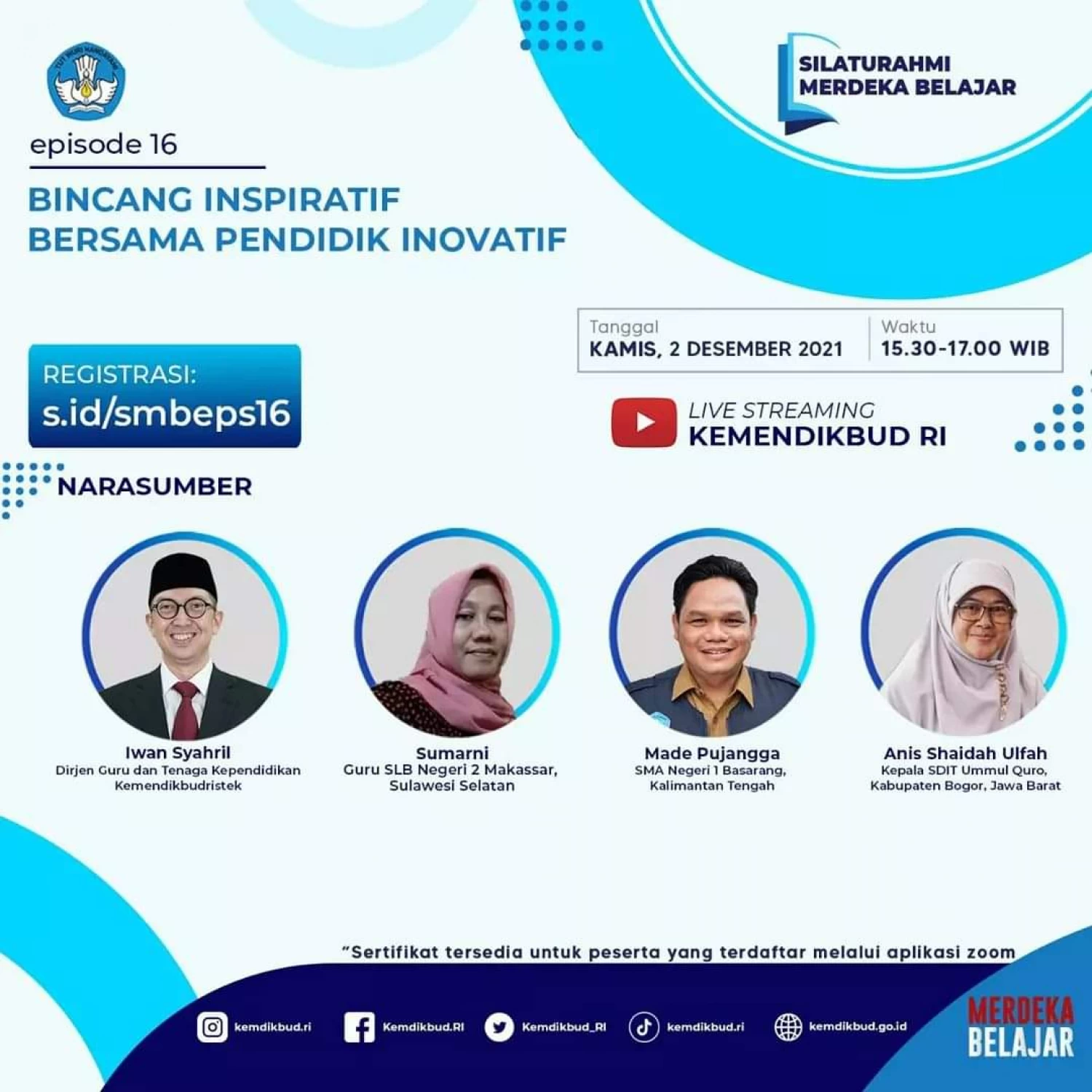 Para Guru di seluruh Indonesia mengikuti Silaturahim Merdeka Belajar melalui zoom dan live streaming You Tube KEMENDIKBUD RI, Kamis, 2 Desember 2021, Pkl. 15.30 – 17.00, pada episode 16 kali ini mengangkat tema “Bincang Inspiratif Bersama Pendidik Inovatif”.
