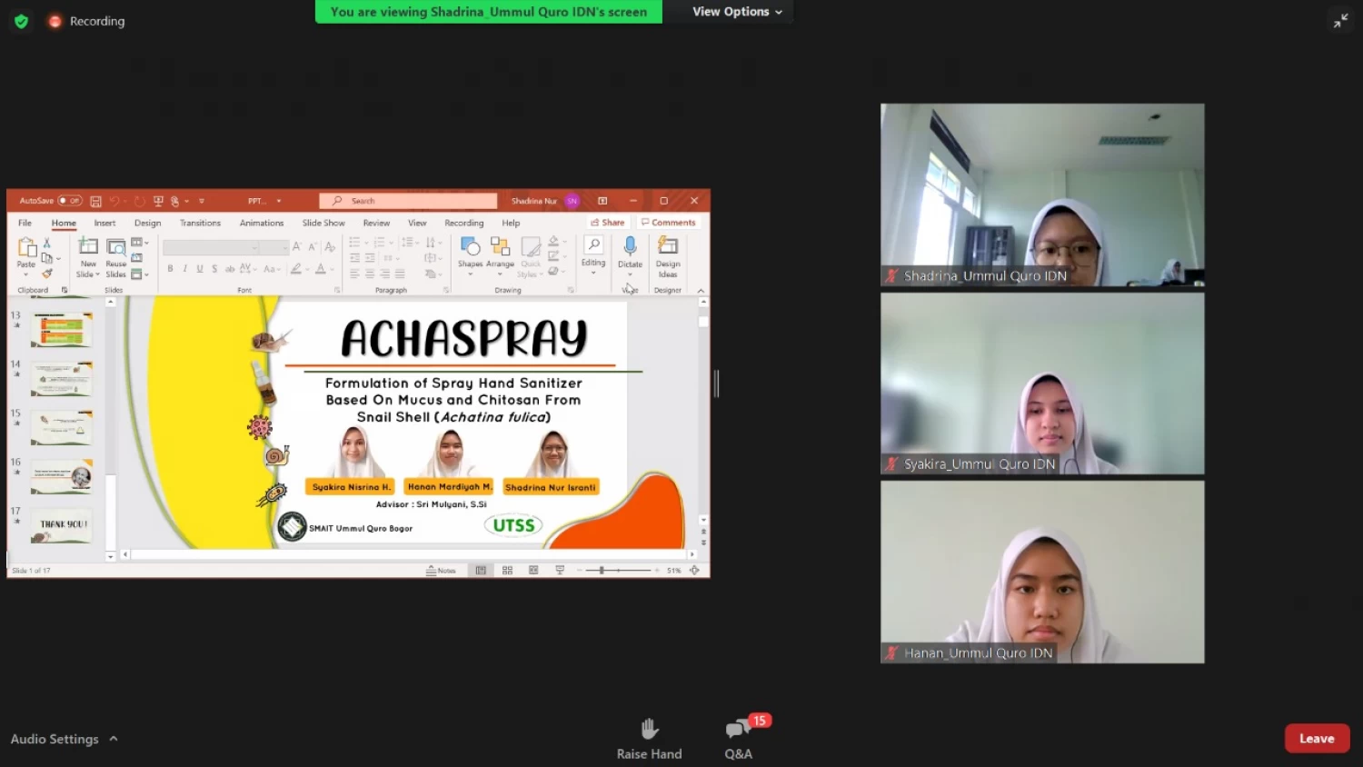 SMAIT UQ berkesempatan mempresentasikan hasil penelitian siswa dengan judul “ACHASPRAY : FORMULASI SEDIAAN HAND SANITIZER SPRAY BERBASIS LENDIR DAN KITOSAN CANGKANG BEKICOT (Achatina fulica)” . Penelitian ini dipresentasikan oleh Shadrina Nur Isranti, Hanan Mardiyah Mulyana dan Syakira Nisrina Hardianti. Pada awalnya, penelitian ini merupakan penelitian Program Penelitian Ilmiah Sekolah yang pada akhirnya meraih Juara 2 di ajang Internasional pada beberapa bulan yang lalu. Penelitian ini memiliki latar belakang yang sesuai dengan program SDGs (Sustainable Development Goals), sehingga berpeluang untuk dipresentasikan kembali dalam Webinar Internasional. Para partisipan juga aktif bertanya dalam sesi diskusi.
