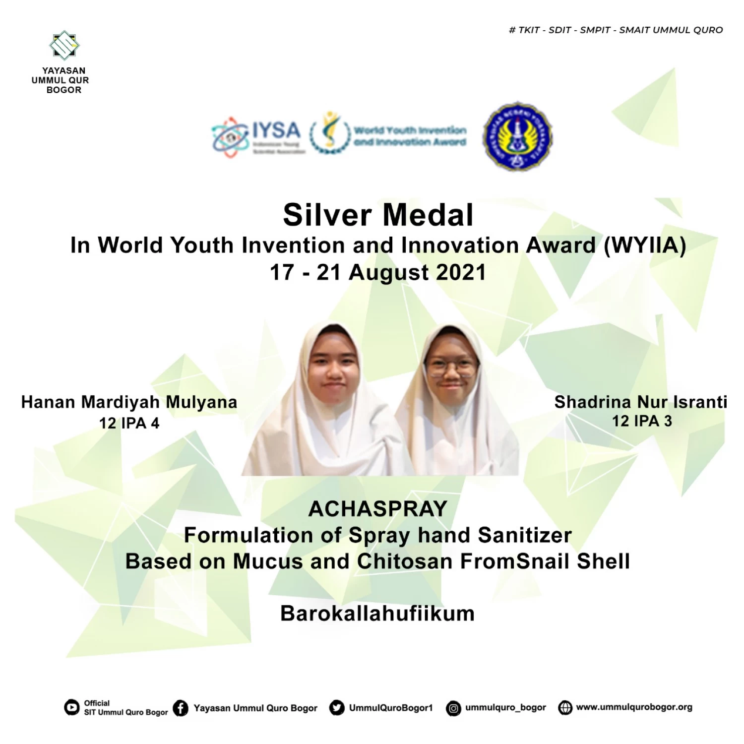 Hanan dan Shadrina atau biasa dipanggil sasa menyampaikan bahwa penelitian yang mereka beri judul Acha Spray : Formulation of Spray Hand Sanitizer Based on Mucus and Chitosan from Snail Shell (Achatina fullica) ini adalah membuat produk handsanitizer berbahan dasar lendir dan cangkang keong. Lendir keong mengandung zat antiseptik, dan cangkang keong mengandung senyawa kitin yang dapat diproses menjadi kitosan. Kitosan memiliki sifat antibakteri. Penelitian ini mengkombinasikan antara cangkang dan lendir, setelah itu dilakukan beberapa pengujian. Hasil uji antibakteri terhadap bakteri S.Aureus dan E.Coli menunjukkan bahwa baik kitosan, lendir dan campuran kitosan dan lendir termasuk kategori kuat dalam menghambat pertumbuhan bakteri dan produk spray gel efektif membunuh E.Coli dan S.Aureus dengan persentase 99%.