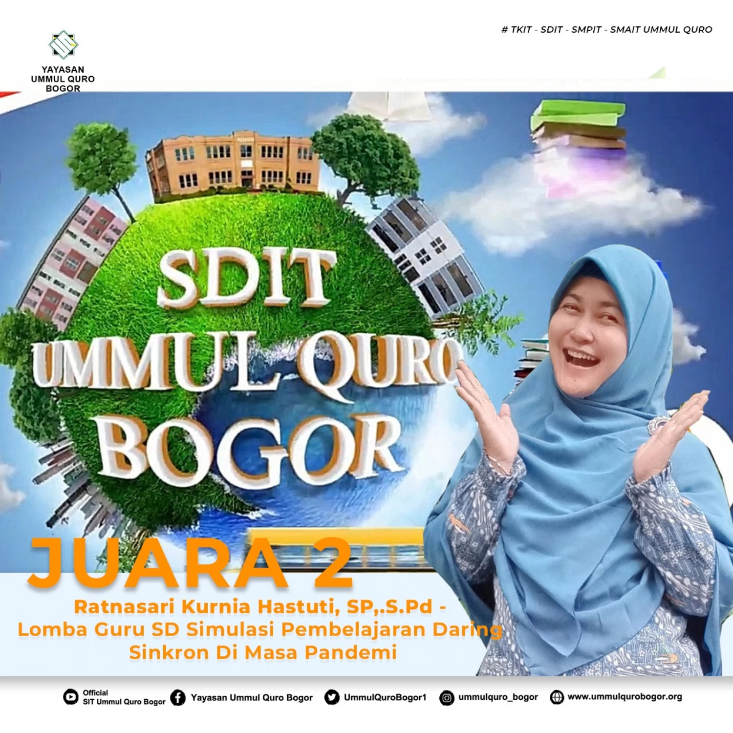 Menjelang Munas Nasional V, Jaringan Sekolah Islam Terpadu Indonesia mengadakan Lomba Simulasi Pembelajaran jarak jauh di masa pandemic yang diikuti oleh para guru SIT dari Seluruh Indonesia. SIT Ummul Quro Bogor, ikut berpartisipasi dengan mengirimkan beberapa video dari para gurunya. Alhamdulillah, dua orang guru mewakili Provinsi Jawa Barat untuk dilombakan di tingkat nasional. Bersyukurnya kami, keduanya mendapat Juara di Tingkat Nasional. Juara kedua, diraih oleh Ratnasari Kurnia Hastuti, Juara ketiga Komarudin.