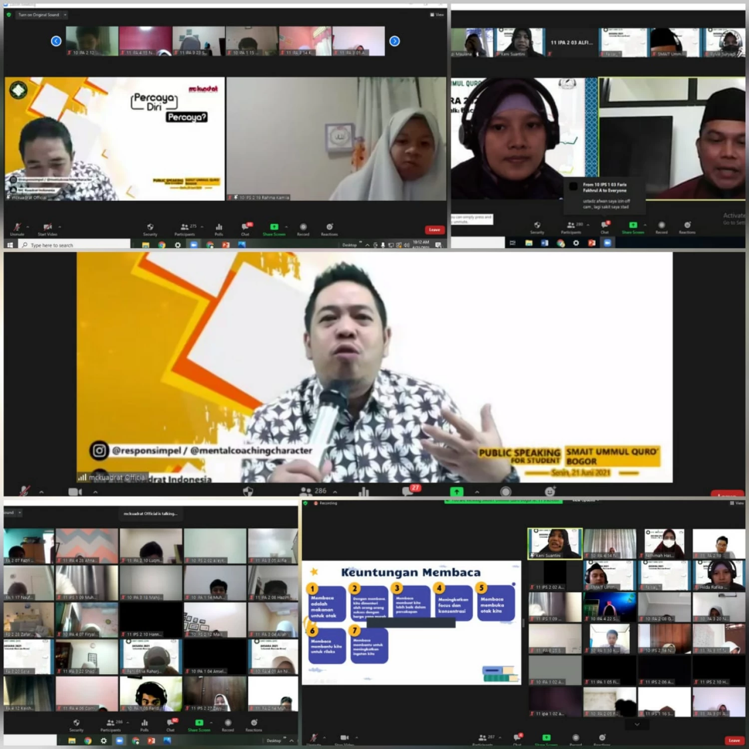 Kegiatan ini dihadiri oleh siswa-siswi kelas 10 & 11 beserta guru-guru sebanyak 290 peserta. Acara ini bertujuan untuk menumbuhkembangkan literasi pada siswa-siswi SMAIT UQ, dapat membaca teks dengan baik dan dapat berbicara dengan baik didepan umum. Para siswa dibekali Penguatan Literasi oleh Ustzh Keni Suantini, S.Pd,. Kegiatan diakhiri oleh Kak Rio MC Quadrat dengan tema "Public Speaking for Student".